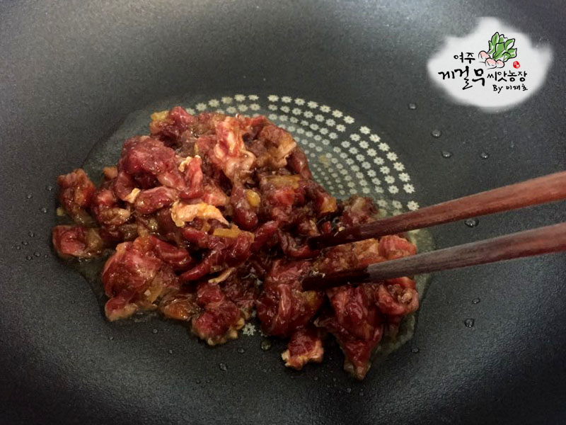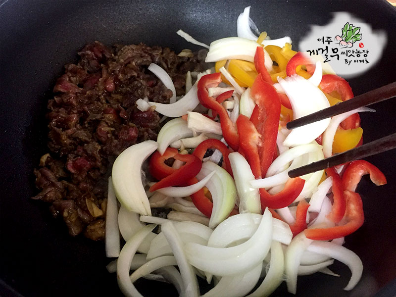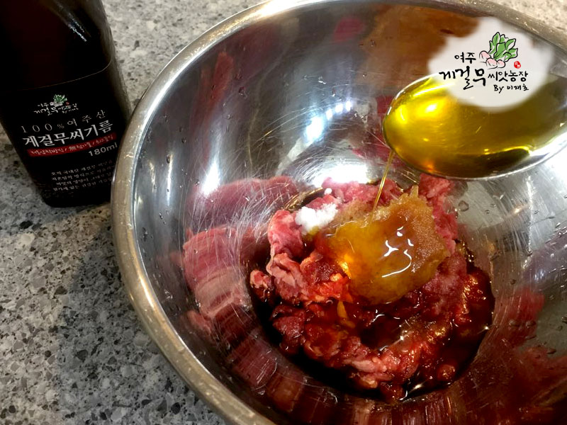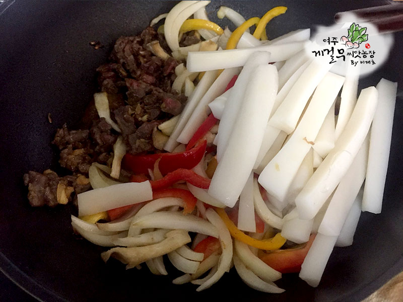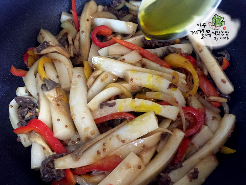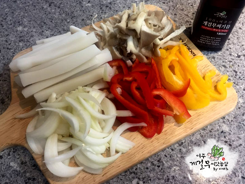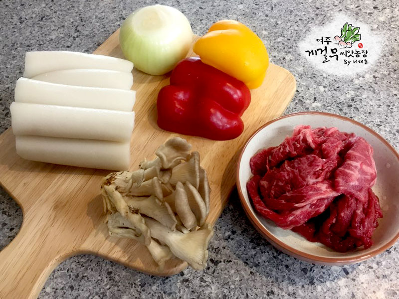 반찬으로도 간식으로도 온 가족이 좋아할만한 메뉴! 게걸무씨앗농장과 함께 시작합니다~ 재료 가래떡 4개 + 불고기용 쇠고기 100g + 느타리버섯 한줌 + 양파 + 파프리카 + 게걸무씨앗기름 1큰술 + 게걸무씨앗 2큰술 + 참깨 간장 2큰술 + 꿀 2큰술 간장 2큰술 + 게걸무씨앗기름 1큰술 + 다진마늘 1큰술 + 설탕 1작은스푼 빨간 파프리카 반개, 느타리버섯 한줌 준비했습니다. 준비하고 보니 청피망이 절실히 필요해 보이네요~ 게걸무씨앗기름기름 1큰술, 밑간을 해두었습니다.