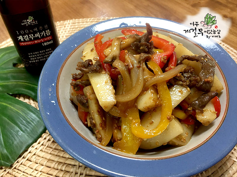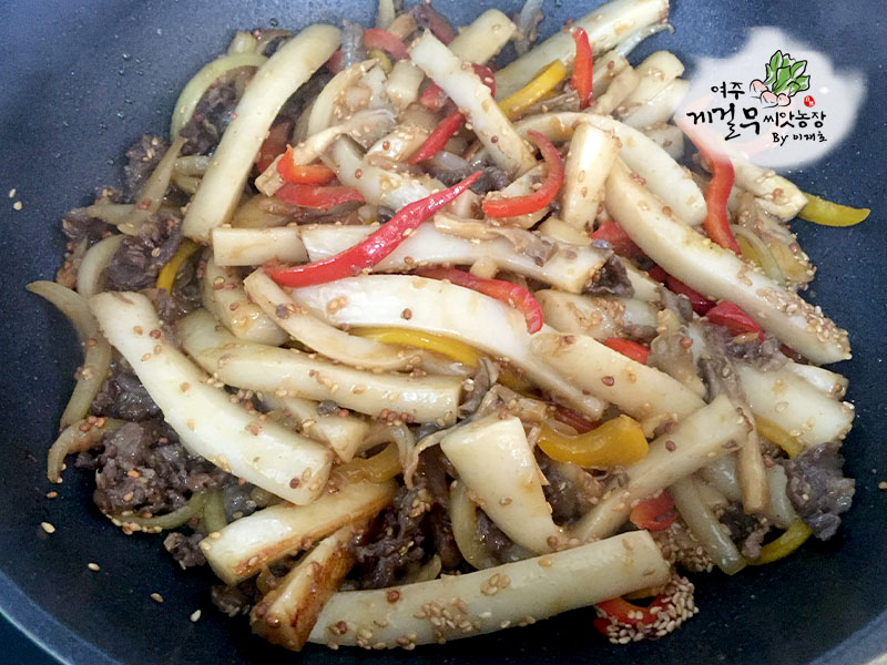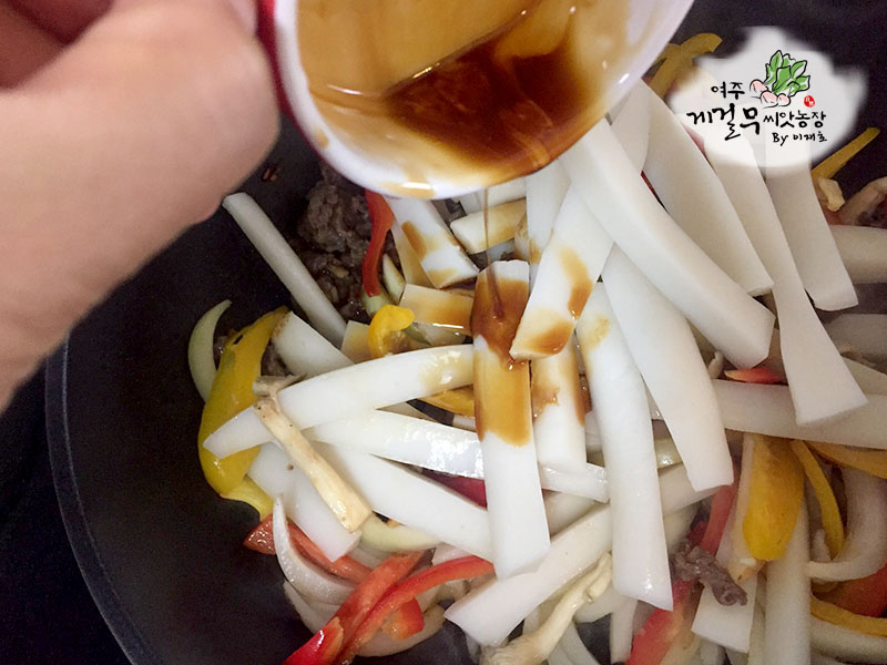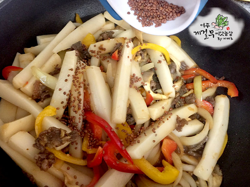양념간장을 넣어줍니다. 게걸무씨앗 2큰술을 넣고 볶아 줍니다. 마지막으로 게걸무씨앗기름과 참깨를 넣어 고소함을 추가하였습니다. 달달짭조름한 소스에 아삭한 야채와 부드러운 고기, 쫀득한 떡이 잘 어울립니다. 감칠맛을 더하네요~