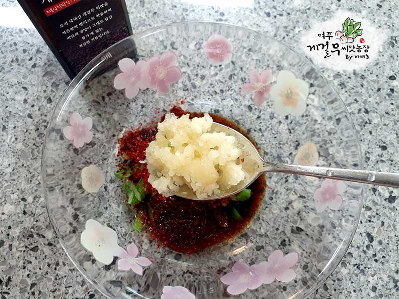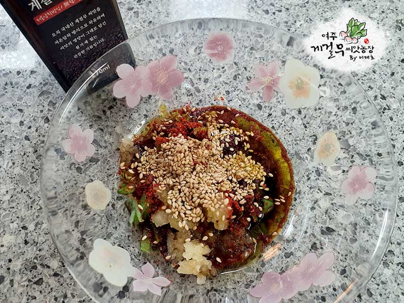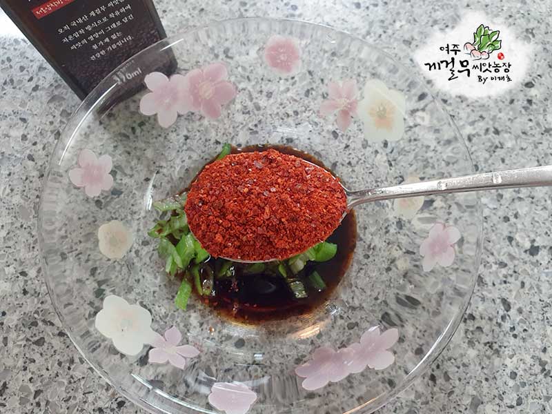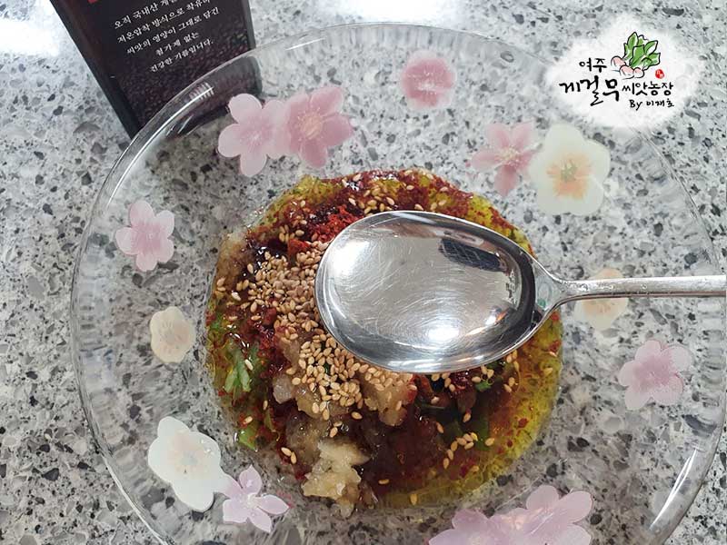 다진 파 2큰술, 간장 3큰술, 고춧가루 1큰술, 다진마늘 1큰술, 올리고당 약간, 물 2큰술, 고소함을 증폭시킬 게걸무씨앗기름 1큰술, 마지막으로 통깨를 넣고 양념장을 만들어 줍니다. 짜지않고 단짠단짠한게~ 풍미를 올려줍니다.