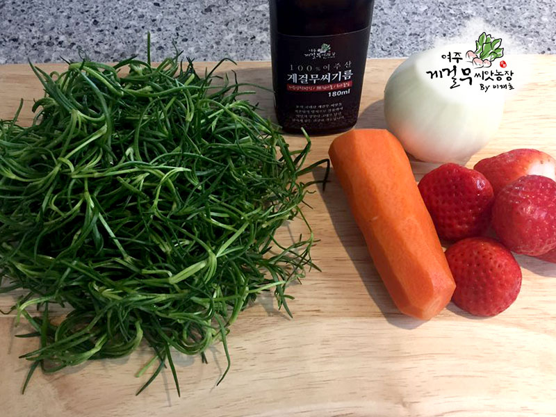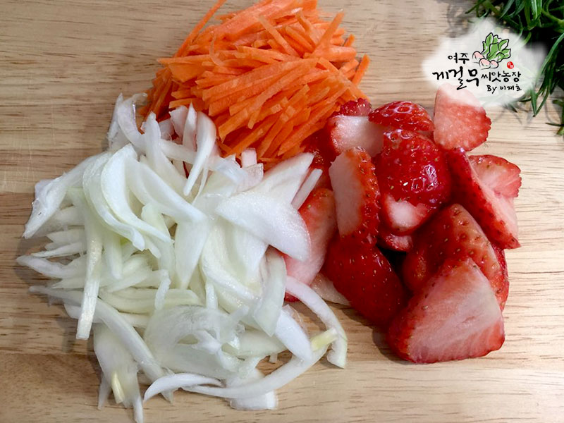 . . . . . 재료 : 세발나물 100g + 양파(중) 1/2개 + 당근 + 딸기 4~5개